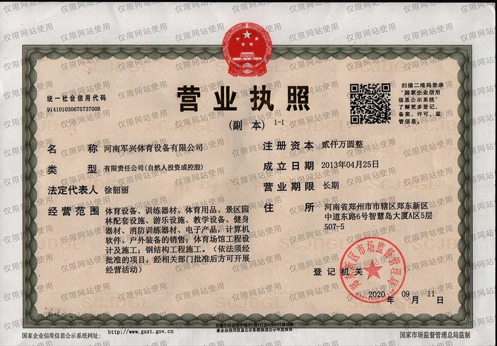 河南軍興體育設(shè)備有限公司經(jīng)營(yíng)范圍包括體育設(shè)備、訓(xùn)練器材、體育用品、教學(xué)設(shè)備、健身器材、消防訓(xùn)練器材、電子產(chǎn)品、消防防墜落部件、高空防護(hù)裝備的銷(xiāo)售,體育場(chǎng)館工程設(shè)計(jì)及施工,鋼結(jié)構(gòu)工程施工。